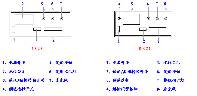 5、發送機為間歇式發送數據,每兩分鐘傳輸一次,傳輸時間為1秒。每接收到一組數據時,面板接收指示燈8閃爍,呈綠色。表明發送機工作正常,數據顯示為當前的水位數據并且保持到下一次接收新的數據為止。