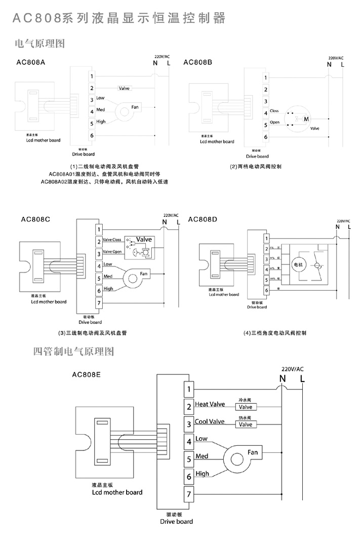 AC808系列數字恒溫器適用于風機盤管、電動閥、電動風閥、電動風口及供熱設備的溫度控制。采用特大屏幕液晶顯示,通過溫控器內部的NTC(負溫度系數)溫度傳感器,檢測出室內溫度,并實時地與用戶所設定溫度進行比較,自動調節冷暖氣的進氣量和開啟或關閉管道電動閥,達到保持室內恒溫的目的。